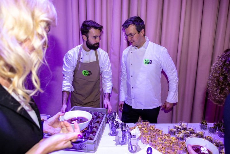 Zum Ausklang des Berliner Kantinenfests kamen die Gäste gemeinsam auf „den Geschmack des Wandels“: Die Trainer der Kantine Zukunft Patrick, Manuel, Robert, Matthias und Amir servierten den Gästen von ihnen zubereitete Kostproben. Bei wärmendem Beets Bourguignon mit Sauerrahm und Domberger-Brot oder Grünkohl mit Apfel und Senfcreme, tauschten sich die Gäste über den Abend, ihre Arbeit und ihre Ideen für eine zukunftsweisende Gemeinschaftsgastronomie aus!