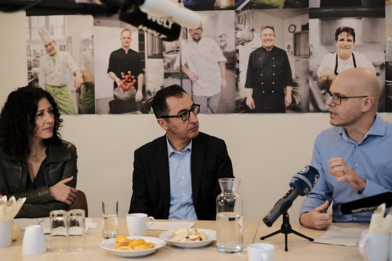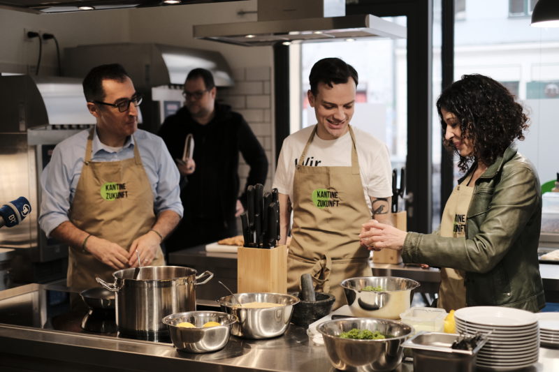 Seit 2019 arbeiten wir intensiv mit den unterschiedlichsten Kantinen von der Kita bis zum Bundeskanzleramt zusammen und setzen uns gemeinsam mit Berliner Küchenteams für eine zukunftsfähige Ernährungswende ein. Im Gespräch mit Cem Özdemir und Bettina Jarasch teilten wir unsere Erfahrungen aus der Kantinen-Werkstatt und erklärten, wie durch das Beratungsprogramm deutliche Weiterentwicklungen in Bezug auf Geschmack, Gesundheit und Nachhaltigkeit erreicht werden können.