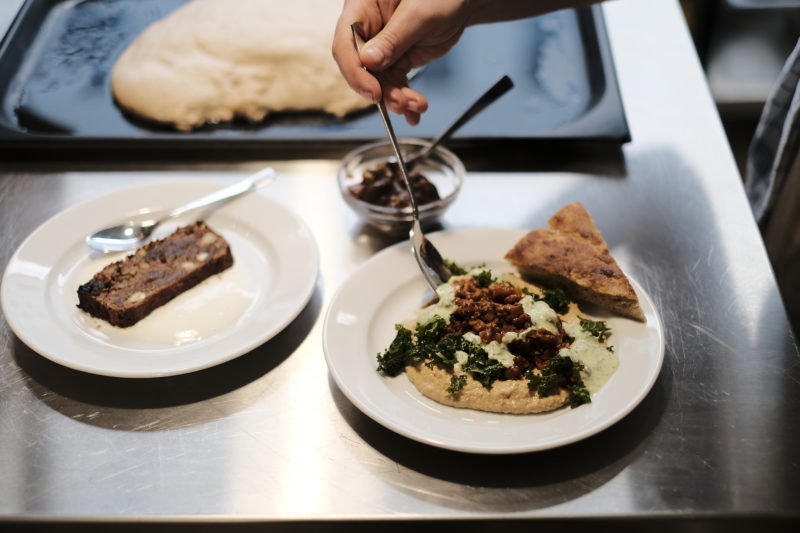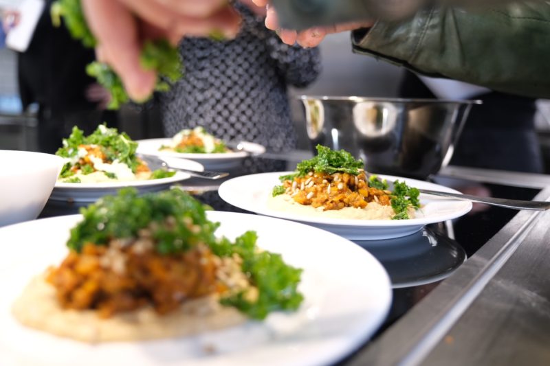 Genau deshalb ging es auch in Schürze und mit hochgekrempelten Ärmeln an die Töpfe für letzte Zubereitungsschritte und das Abschmecken von Hauptgang und Dessert: Das Shakshuka mit Sonnenblumenhack garnierten die Politer*innen mit knusprig frittiertem Grünkohl, während sie das saftige Früchtebrot mit einem cremigen Schokoladen-Hafer-Mousse samt Krokant anrichteten. Alle Anwesenden waren vom Geschmack der Transformation überzeugt. Oder wie es der Bundeminister für Ernährung und Landwirtschaft Cem Özdemir auf den Punkt brachte: „Sensationell. Das ist gesund und schmeckt gut.“