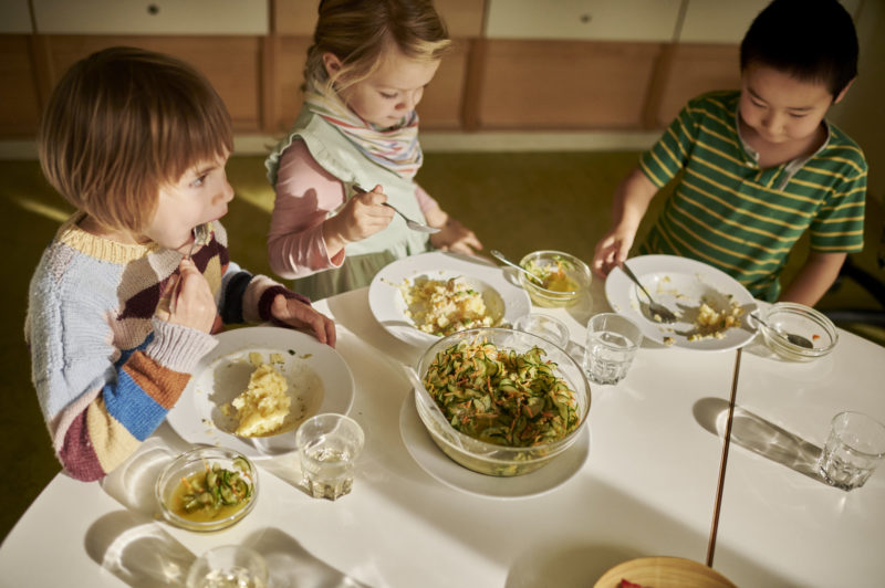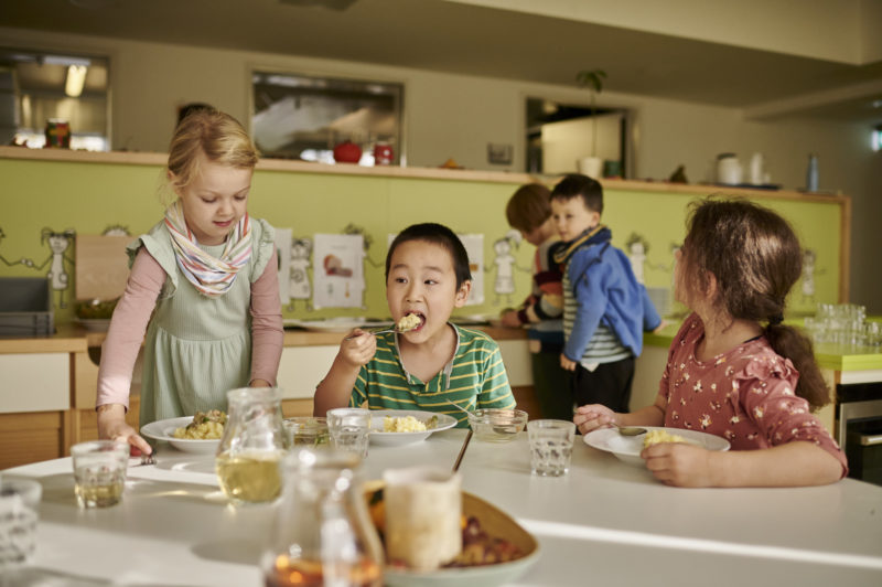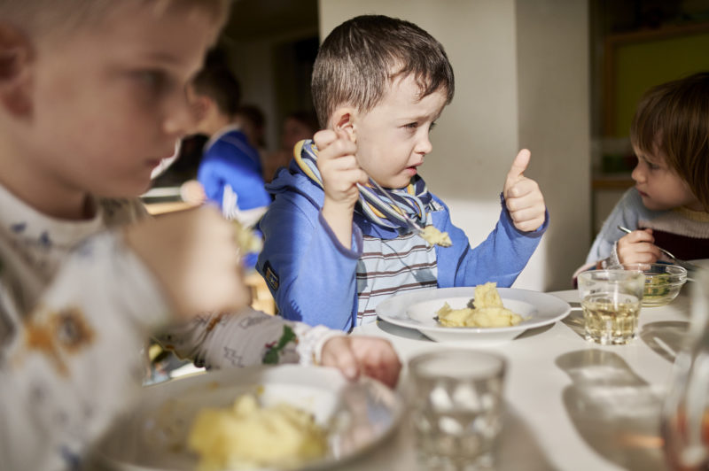 Auf die Frage nach dem Lieblingsgericht antworten die Kinder beim Mittagessen begeistert: Kartoffelbrei! Zum Glück gibt es das heute. Dazu reicht das Kinder-Restaurant des FRÖBEL-Kindergartens „Im Grünen“ Fischragout mit Karottengemüse und Gurkensalat. Der Kartoffelbrei ist zwar eindeutig der Renner, doch die Kinder wagen sich auch an die leckere Sauce, entweder nur mit Gemüse oder mit Fisch. Das Konzept der Kindergarten-Küche ist es, dass die Kinder selbst entscheiden dürfen, was ihnen schmeckt. Alles wird getrennt angerichtet und kann einzeln auf die Teller genommen werden. Dies ist sowohl pädagogisches Konzept als auch ein gutes Mittel, um Lebensmittelabfällen entgegen zu wirken. „Natürlich achten wir auch auf eine gesunde und ausgewogene Ernährung. Schließlich nehmen die Kinder ihre meisten Mahlzeiten bei uns ein“, betont Anja Bundschuh, die Leiterin des Kindergartens. Sie ist voller Lob für die Speisenvielfalt und kulinarische Qualität, die die Frauen in der Küche jeden Tag auf die Teller zaubern: „Die Qualität des Essens hat sich nach der Umstellung stetig erhöht, der Speiseplan ist viel abwechslungsreicher und unser Budget wird strikt eingehalten.“