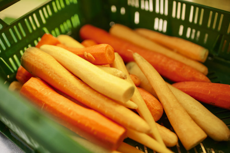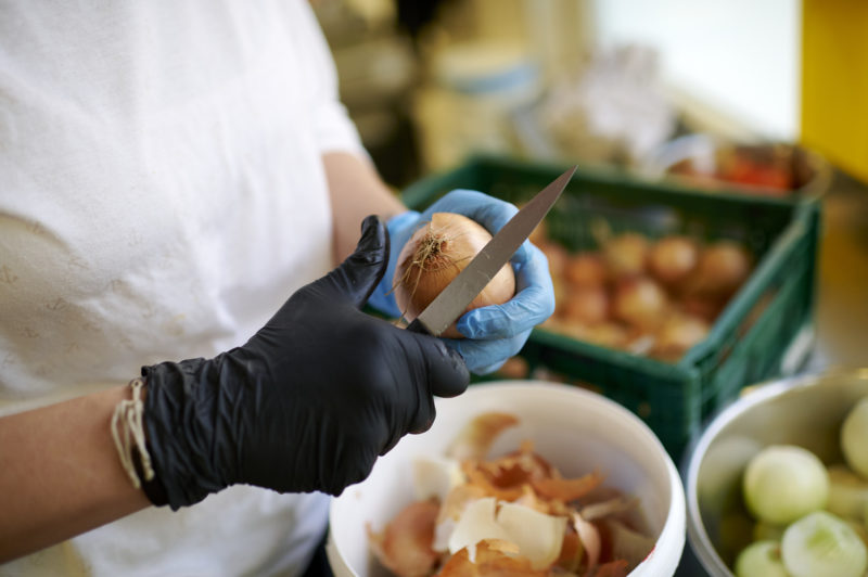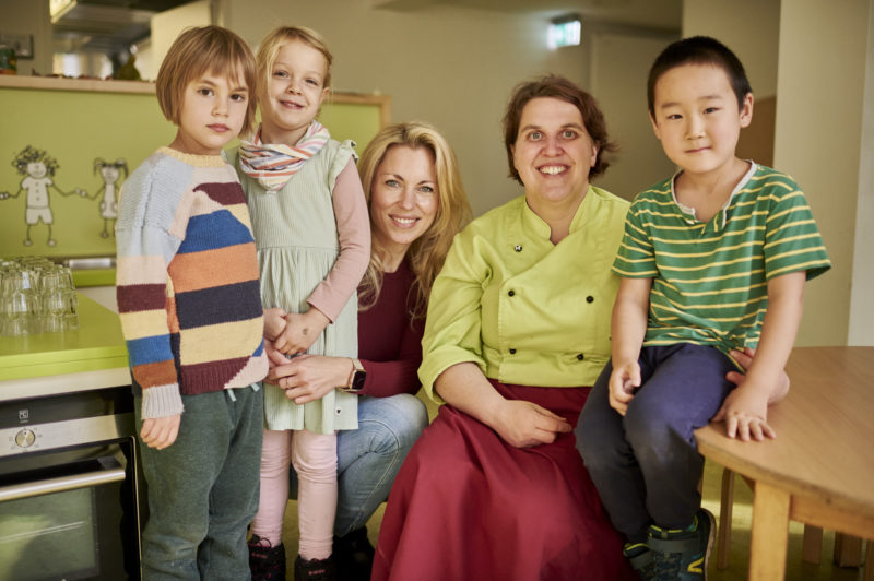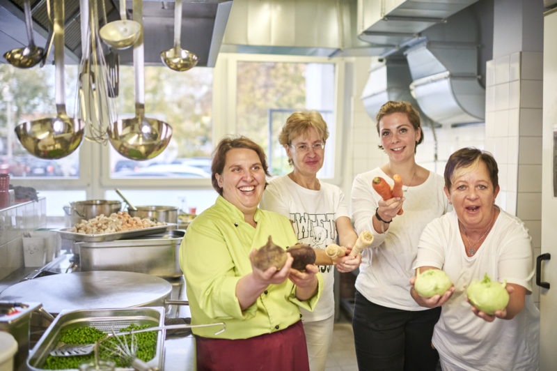 Auch die Familien und die rund 50 Pädagog*innen sind mehr als zufrieden mit der Entwicklung der Verpflegung. Vor sieben Monaten lag der Bio-Anteil noch bei 10 Prozent, nach der Begleitung durch die Kantine Zukunft beträgt der Anteil 94 Prozent. Was hat sich seitdem verändert? „Oh, vieles“, entgegnet die Hauswirtschaftskraft Silvana Dochow spontan. „Die Speisepläne sind jetzt pflanzenbetonter, Fisch und Fleisch gibt es mittags einmal die Woche im wöchentlichen Wechsel, Frühstück und Vesper kommen ganz ohne aus.“ Ihre Kollegin Gabriela Wilke, die bereits seit 12 Jahren in der Küche des Kindergartens arbeitet, ergänzt strahlend: „Es wird einfach anders gearbeitet. Besser geplant, woanders eingekauft und frisch gekocht. Und ja, es ist mehr Aufwand, jeden Tag die Speisen handwerklich zuzubereiten, aber es wird auch mit mehr Liebe gekocht.“ Fertigsuppen oder Saucen aus der Tüte gibt es hier nicht. Aus Gemüseresten und den Schalen machen die Köchinnen Gemüsebrühe. Weggeworfen wird so wenig wie möglich. Sabrina Pieloszyk, gelernte Restaurantfachfrau und neu im Team, kennt es gar nicht anders und ist einfach begeistert von den „coolen Mädels“. Die Stimmung ist ausgelassen, obwohl konzentriert gearbeitet wird, immerhin muss das Essen für 265 hungrige Kinder in zwei Stunden fertig sein.