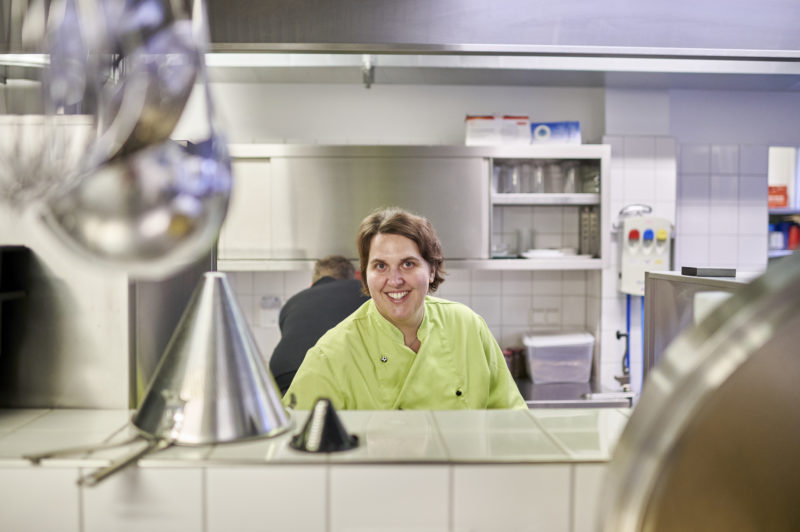 Christiane Oppler ist gelernte Köchin und arbeitet seit Oktober 2020 beim Kindergarten „Im Grünen“. Als Mutter zweier Kinder musste sie nach deren Geburt eine Arbeit suchen, bei der sie geregelte Arbeitszeiten hat. Das ist in der Gastronomie selten der Fall. Deshalb arbeitete Oppler acht Jahre als Briefträgerin, bis sie es wieder zum Kochen zog und sie im Kindergarten in Schöneweide ihrem Wunschberuf mit familienfreundlichen Arbeitszeiten nachgehen konnte. Für sie war es gar nicht schwer, sich auf die ganzen Veränderungen einzulassen, zumal sie am Trainingsprogramm mit großem Vergnügen teilgenommen hat. Auch der Austausch mit Kolleg*innen beim Kantinen-Treff und die Koch-Workshops halfen ihr beim Umstellungsprozess.