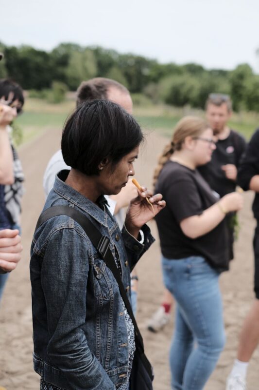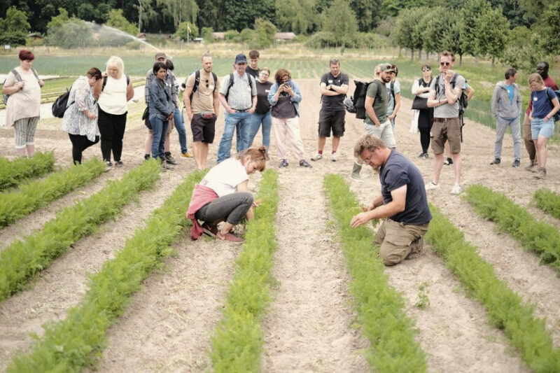 Gemeinschaftliches Lernen steht auch bei der heutigen Exkursion im Fokus. Bei der Besichtigung können die 20 Teilnehmenden viel über Schädlinge, Samen und Düngemethoden lernen und miteinander ins Gespräch kommen. Nach einem spannenden Vortrag zum Melonenanbau und Gurkenkunde im Gewächshaus, spaziert die Gruppe durch ein Kornfeld mit blühenden Mohnblumen zum großen Anbaubereich, wo es einiges über den Knoblauchanbau zu erfahren gibt. Im zweiten Gewächshaus ziehen die Köch*innen und Pädagog*innen aus der Gemeinschaftsgastronomie zwei verschiedene Karottensorten aus der Erde und verkosten diese direkt. Wie unterscheidet sich die hybride Sorte von der samenfesten Möhre im Geschmack? Während die Teilnehmenden an Kohlrabiblättern knabbern und das frische Gemüse verkosten, erklärt Christian Heymann, warum er am liebsten lila Kohlrabi anbaut. Na, wisst ihr es? Es ist eine Entscheidung für natürliches Schädlingsmanagement, denn Vögel und Mäuse essen den lila Gemüsekohl nicht so gerne wie den grün-weißen.